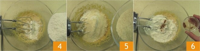 Agora adicione a farinha de trigo 4, a farinha de amêndoas 5 e a canela 6.