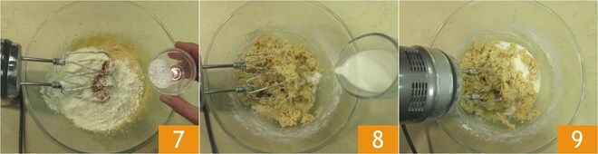 Adicione também o fermento 7 e, enquanto mistura tudo com a batedeira, adicione o leite aos poucos 8. Continue batendo 9 até obter uma mistura homogênea.