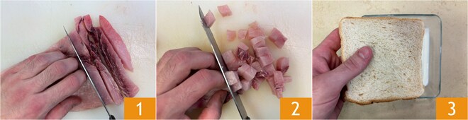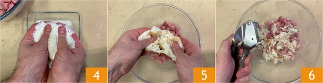 Para preparar os bolinhos de peixe-espada, primeiro retire a pele e o osso central do peixe-espada e corte primeiro em tiras 1 e depois em cubos de cerca de 1 cm 2. Transfira tudo para uma tigela e reserve. Molhe o pão de forma no leite 3.