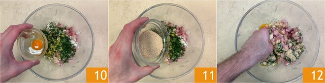 Coloque o ovo na tigela 10 e a farinha de rosca 11, em seguida amasse 12 até obter uma mistura compacta, mas trabalhável. Se necessário, adicione mais farinha de rosca.