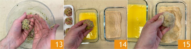 Modele 12 bolinhos do mesmo tamanho e ligeiramente ovais 13, passe-os primeiro no ovo 14 e depois na farinha de rosca 15, aderindo bem em toda a superfície dos bolinhos.