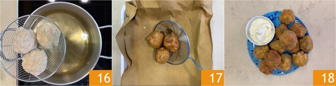 Frite em óleo de amendoim a 180°C por 10 minutos ou até dourar 16. Frite 3-4 bolinhos de cada vez para não abaixar muito a temperatura do óleo. Coloque-os em papel absorvente 17 para eliminar o excesso de óleo. Os bolinhos de peixe-espada estão prontos para serem servidos, talvez acompanhados de maionese 18.