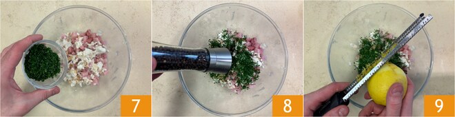 Adicione a salsinha picada 7, ajuste o sal e a pimenta 8 e adicione também as raspas de limão 9.