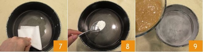 e distribua bem sobre toda a superfície da forma, ajudando-se com papel toalha 7. Neste ponto, enfarinhe-a, usando uma colher de farinha e vire a forma para eliminar o excesso. 8. Quando a forma estiver untada e enfarinhada, pegue a massa do bolo 9