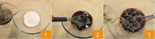 Para preparar o bolo de água de café comece pelo café: com uma cafeteira prepare 330 g de café; coloque-o em uma jarra e deixe esfriar. Coloque o açúcar em uma tigela grande e, em seguida, despeje o café já frio 1. Misture bem para dissolver o açúcar 2 e depois adicione o óleo de sementes, sempre mexendo 3.