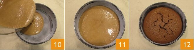 e despeje-a na forma 10. Uma vez que tudo tenha sido despejado, se necessário, ajude-se com uma espátula para distribuir a massa uniformemente 11 e asse em forno estático já aquecido a 180° por 50 minutos. Decorrido esse tempo, faça o teste do palito: se ele sair seco e limpo significa que o bolo está assado. Retire do forno e deixe esfriar 12. Enquanto o bolo esfria, prepare com a cafeteira mais 40 g de café e deixe esfriar também.