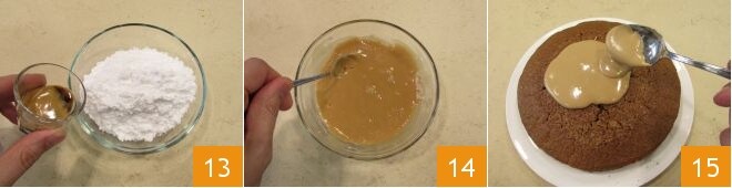 Agora dedique-se à preparação da cobertura de café: coloque o açúcar de confeiteiro em uma tigela e despeje aos poucos o café frio 13, mexendo bem até eliminar os possíveis grumos e obter uma cobertura fluida, homogênea e lisa 14. Quando o bolo estiver frio, desenforme-o e coloque-o em um prato. Despeje a cobertura sobre o bolo 15,