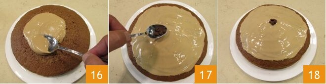 e distribua bem sobre toda a superfície, ajudando-se com as costas de uma colher 16. Decore com alguns grãos de café 17 e deixe descansar até que a cobertura esteja seca 18. Seu bolo de água de café está pronto para ser degustado!