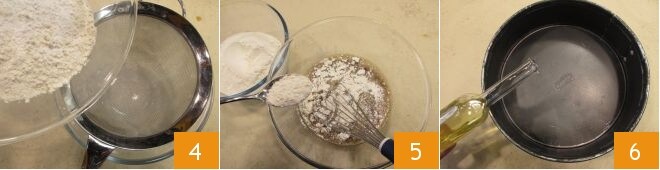 Peneire a farinha com o fermento em uma tigela à parte 4 e depois adicione as partes secas, uma colher de cada vez, à emulsão de café, açúcar e óleo, mexendo bem para evitar grumos 5. Agora, proceda para untar e enfarinhar a forma: despeje um pouco de óleo de sementes em uma forma de 24 centímetros de diâmetro 6,