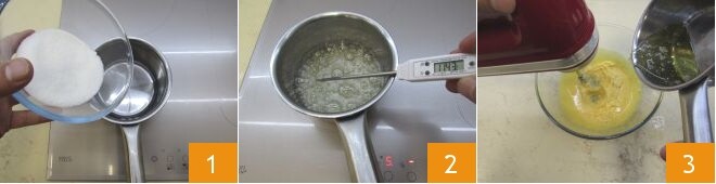 Para preparar o bolo floresta de panetone, comece com o creme de mascarpone. Em uma panela, coloque a água e o açúcar 1, misture e acenda o fogo, levando a temperatura a 121°: para esta operação, é essencial o uso de um termômetro de confeitaria 2. Quando a mistura chegar a 115°, coloque as gemas em uma tigela e comece a batê-las com uma batedeira elétrica. Ao atingir a temperatura, despeje a calda em fio com as batedeiras em funcionamento 3.