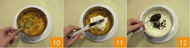 Espalhe uma camada grossa de geleia de laranja 10 e depois uma camada rica de creme, distribuindo cuidadosamente com uma espátula 11. Conclua a primeira camada polvilhando com raspas de chocolate 12.