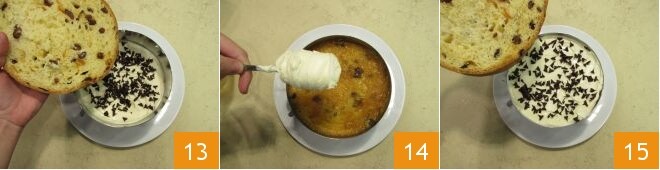E neste ponto, comece novamente com panetone 13, geleia, creme 14 e finalmente raspas. No último disco de panetone 15.