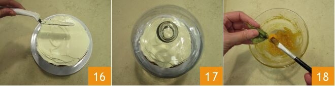 despeje mais um pouco de geleia e depois o creme restante, nivelando cuidadosamente 16. Então, cubra com uma cúpula de vidro e deixe na geladeira para firmar por pelo menos uma hora 17. Enquanto isso, você pode passar para as decorações. Amarre as varetas de canela, de preferência as pequenas, com barbante para alimentos. Depois, lave e seque os raminhos de murta. Por último, lembre-se de limpar também os animais que serão usados para a decoração. Por último, os fisalis, pincele-os com geleia 18.