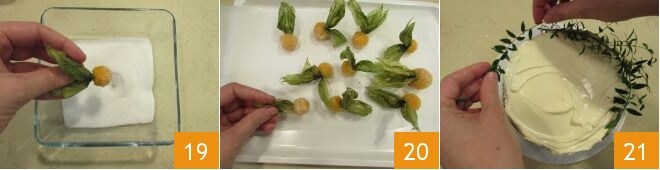 Depois, passe-os no açúcar 19 e, aos poucos, coloque-os sobre uma bandeja com papel manteiga 20. Após o tempo, retire o bolo da geladeira e remova o anel. Finalmente, decore o doce começando pela murta, que será disposta em meia-lua na superfície 21.