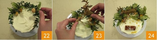 Depois, adicione os fisalis cristalizados 22, cervos e veados 23 e, para finalizar, o maço de canela. Polvilhe tudo com um pouco de neve (o açúcar de confeiteiro, entenda-se) e o seu lindo bolo floresta de panetone está pronto 24.