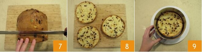 Enquanto isso, cuide do panetone. Nós escolhemos um panetone de 18 cm de diâmetro, assim teremos muito pouco desperdício, já que a cúpula será descartada (para reutilizá-la, você pode preparar deliciosos cake pops). Então, proceda aos cortes com uma faca serrilhada: primeiro, faça incisões superficiais traçando linhas a cada 3 cm ao redor do panetone, que servirão como guia durante o corte. Depois, corte ao longo das linhas, exatamente como se faz para o pão de ló 7: assim, você obterá 3 discos precisos 8. Para fazer um trabalho limpo e preciso, coloque a base do panetone em um anel de confeitaria colocado sobre um prato 9.