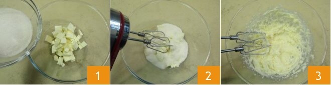 Para preparar o bolo madeira, comece colocando em uma tigela a manteiga em temperatura ambiente junto com o açúcar 1. Depois, acione as batedeiras, ou alternativamente você pode usar a batedeira planetária ou batedores manuais, e bata por 5 minutos 2 até que a mistura se torne clara e espumosa 3.