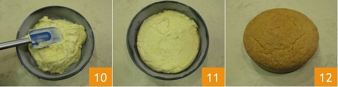 Transfira-a para uma forma de 20 cm de diâmetro já untada e enfarinhada 10, nivele cuidadosamente a superfície 11 e asse na prateleira mais baixa do forno, pré-aquecido em modo estático a 160°, por cerca de 70 minutos. Depois de assado, não restará mais do que desenformar e saborear o bolo madeira 12!