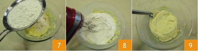 e adicione enquanto as peneira com uma peneira 7. Acione novamente as batedeiras em baixa velocidade, apenas o tempo necessário para misturar tudo 8. Aqui está a massa pronta 9.