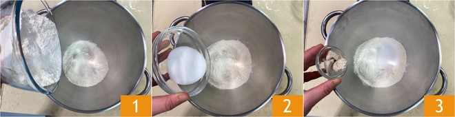 Para preparar a massa dos bomboloni, coloque em uma batedeira equipada com gancho a farinha 00 e a manitoba 1, o açúcar 2 e o fermento biológico fresco esfarelado 3.
