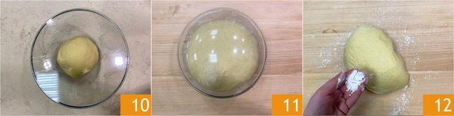Coloque a massa dentro de uma tigela, cubra com filme plástico e deixe crescer a uma temperatura de 26°-28° por cerca de 3 horas e meia 10 ou até triplicar de volume 11. Após o tempo de levedura, pegue a massa e transfira para uma superfície levemente enfarinhada 12.