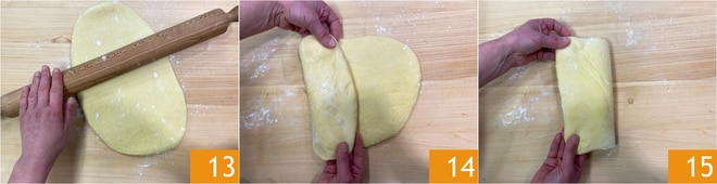 Estenda-a levemente com um rolo até formar um retângulo com cerca de 2 cm de espessura 13. Dobre uma das laterais mais curtas 14, a esquerda, para o centro de modo que ao dobrar o outro lado, este se alinhe com a primeira dobra 15.