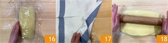 Cubra com filme plástico 16 e um pano de prato 17 e deixe descansar por 10 minutos. Após os 10 minutos, gire e estenda novamente a massa com o rolo formando sempre um retângulo 18.