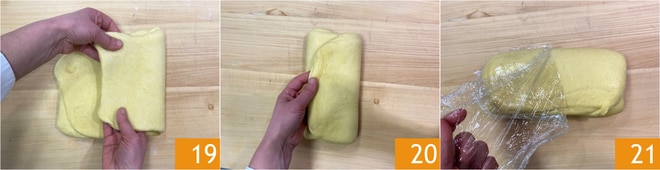 Faça mais 2 dobras começando pela aba direita 19 e depois a esquerda 20. Deixe o bloco obtido descansar 21 por mais 10 minutos, certificando-se de cobri-lo com filme plástico e com um pano, repita mais uma vez as 2 dobras e o descanso de 10 minutos (total de 3 vezes).