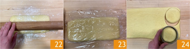 Após o tempo de descanso, estenda o bloco com o rolo até uma espessura de cerca de 1,2 cm 22. Cubra com filme plástico e deixe descansar por 10 minutos antes de cortar a massa, pois se cortar imediatamente tende a encolher 23. Usando um cortador de massa com 8,5 cm de diâmetro, corte discos de massa 24: você obterá 10 (alternativamente, você pode usar a borda de um copo para cortar).