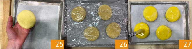 À medida que corta, transfira para uma assadeira forrada com papel manteiga 25. Uma vez prontos, cubra com filme plástico. Deixe os bomboloni crescerem em um local seco por cerca de 45 minutos 26. Pincele-os com gema e creme batidos juntos 27.