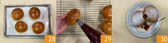 Asse em forno estático pré-aquecido a 175° por 20-25 minutos. Em seguida, retire os bomboloni do forno 28 e deixe esfriar. Depois de frios, transfira a geleia para um saco de confeitar com bico liso e recheie os bomboloni 29. Polvilhe com açúcar de confeiteiro e sirva seus deliciosos bomboloni assados 30!