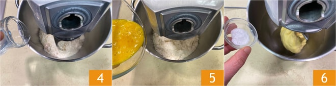Ligue a batedeira e adicione a água aos poucos 4, em seguida, adicione os ovos batidos aos poucos 5. Quando a massa estiver ligada, adicione o sal 6. Deixe a batedeira em velocidade média por cerca de 3-4 minutos.