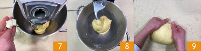Quando a massa se desprender das bordas da tigela, incorpore a manteiga amolecida, um pedaço de cada vez 7, esperando que cada pedaço seja absorvido antes de adicionar o próximo. Uma vez que toda a manteiga tenha sido absorvida, trabalhe a massa por cerca de 10 minutos, até obter uma consistência lisa e compacta 8. Transfira a massa para uma superfície de trabalho, dê algumas dobras e forme uma bola 9.