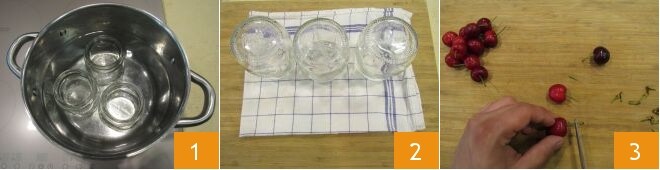 Para preparar as cerejas em aguardente, comece pela sanitização dos potes, como indicado nas diretrizes do Ministério da Saúde, mencionadas ao final da receita. Encha uma panela com água, adicione os potes e deixe-os ferver em fogo brando por cerca de 30 minutos 1. Em seguida, retire-os da água tomando cuidado para não se queimar e coloque-os de cabeça para baixo sobre um pano de cozinha 2. Deixe-os secar e, enquanto isso, cuide das cerejas: lave-as e corte a ponta do cabinho com uma tesoura 3.
