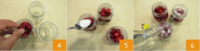Coloque as cerejas dentro dos potes 4, adicione o açúcar (serão cerca de 15 g para cada pote) 5 e cubra com a aguardente 6. Dependendo do tamanho das cerejas e dos potes que você escolher, pode sobrar aguardente.