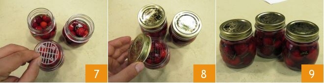 Insira um peso de plástico em cada pote 7, pressione bem e feche os potes apertando bem, mas sem exagerar 8. Deixe-os macerar em um local fresco e seco por pelo menos 30 dias antes de saborear suas cerejas em aguardente 9!