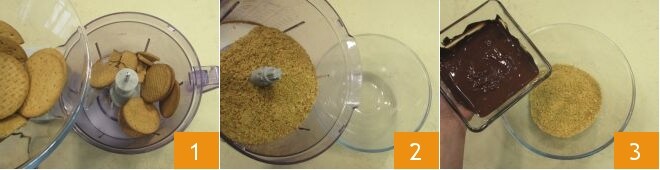 Para preparar o cheesecake de abacate, comece pela base: triture bem os biscoitos, usando um processador de alimentos 1, e depois transfira-os para uma tigela 2. Derreta o chocolate amargo no micro-ondas ou em banho-maria; uma vez morno, despeje-o sobre os biscoitos triturados 3