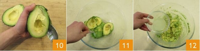 depois retire a polpa com uma colher 10 e amasse-a delicadamente em uma tigela com um garfo 11. Polvilhe com 15 g de suco de limão 12 e misture.