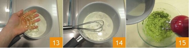 Despeje o creme de leite em uma panela e leve ao ponto de fervura; quando a gelatina estiver amolecida, escorra-a delicadamente e coloque-a no creme de leite quente 13, mexendo tudo bem com um batedor (é importante que a gelatina se dissolva completamente) 14. Com a batedeira elétrica em velocidade média, bata o abacate amassado, adicionando a mistura de creme de leite e gelatina 15,