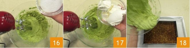 o açúcar 16 e o mascarpone 17 e bata até obter um creme homogêneo. Após o tempo de resfriamento da base, retire-a da geladeira, despeje o creme de abacate sobre ela 18,