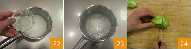e 7 g de suco de limão 22; misture tudo com um batedor manual e em fogo baixo por cerca de dois minutos 23. Retire a gelatina do fogo e deixe esfriar; para ajudar, você pode despejá-la em uma pequena jarra. Enquanto a gelatina esfria, limpe o terceiro abacate: proceda como nos outros, dividindo-o ao meio, removendo o caroço e extraindo a polpa, depois corte apenas uma metade em fatias bem finas 24.