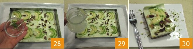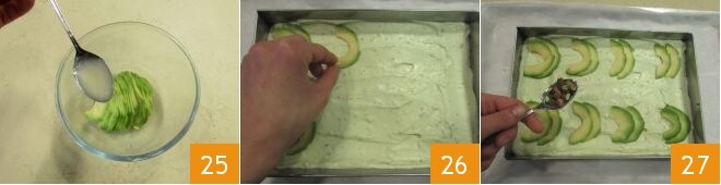 Despeje um pouco de suco de limão nas fatias para que não escureçam. Divida idealmente os retângulos em 8 partes e coloque duas fatias de abacate ligeiramente sobrepostas e bem espaçadas umas das outras até obter os 8 quadrados 26, decore com os pistaches 27