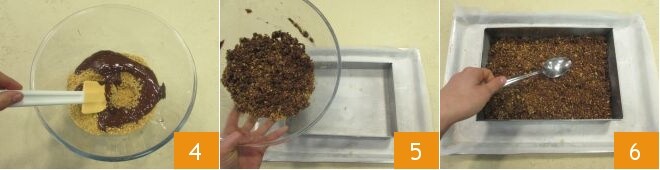 e misture bem 4. Forre uma assadeira baixa com papel manteiga, então coloque um molde retangular sem fundo com medida de 25x17,5 cm. Despeje a mistura de biscoitos e chocolate dentro e nivele usando as costas de uma colher 6. Coloque o molde na geladeira por pelo menos uma hora para compactar bem a base de biscoito.