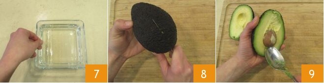 Enquanto isso, prepare o creme: coloque as folhas de gelatina em uma tigela com água fria 7 por pelo menos 10 minutos. Enquanto isso, abra 2 abacates, dividindo-os em duas partes 8: retire primeiro o caroço (se não jogá-lo fora, você pode fazê-lo germinar mergulhando-o em água de modo que a base do caroço esteja bem imersa em água),