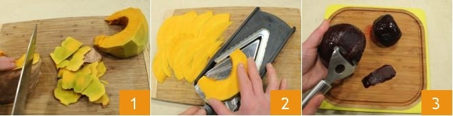 Para preparar as chips de vegetais, comece cortando a abóbora em gomos, depois remova a casca com uma faca 1 e fatie finamente com um mandolim 2. Descasque a beterraba 3