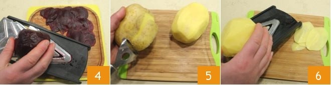 e fatie-a também com o mandolim para obter fatias finas 4. Por último, descasque as batatas 5 e proceda como fez com os outros vegetais: fatie com o mandolim obtendo fatias bem finas 6.