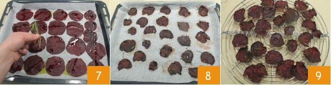 Cubra uma assadeira com papel manteiga, coloque as fatias de beterraba, regue com um fio de azeite de oliva, salgue e tempere com alguns ramos de alecrim 7. Asse as chips de beterraba em forno ventilado a 220° por 20 minutos ou pelo tempo necessário para secá-las (ou em forno estático a 230° por 40 minutos). Quando terminado o cozimento, retire as chips do forno 8 e transfira-as para uma grade para esfriar 9.