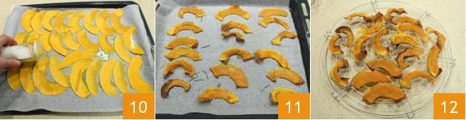 Agora prossiga com a abóbora: distribua as fatias de abóbora em uma assadeira coberta com papel manteiga, tempere com azeite de oliva, sal e alecrim 10, asse as chips de abóbora em forno ventilado a 220° por 10 minutos (ou em forno estático a 230° por 40 minutos). Quando estiverem bem crocantes, retire do forno 11, coloque sobre uma grade e deixe lá até esfriar 12.