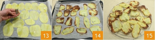 Por fim, proceda da mesma forma com as batatas: coloque as fatias de batata na assadeira coberta com papel manteiga 13, asse as chips de batata da mesma maneira em forno ventilado a 220° por 10 minutos (ou em forno estático a 230° por 15 minutos), terminado o cozimento as batatas ficarão douradas e crocantes, retire do forno 14 e deixe esfriar sobre a grade 15.