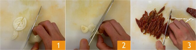 Para preparar o coelho ensopado com azeitonas e tomates secos, primeiro escorra bem os tomates secos do óleo e prepare o caldo de legumes seguindo nossa receita. Corte em fatias tanto a cebola 1 quanto o alho 2. Corte os tomates secos em tiras 3.